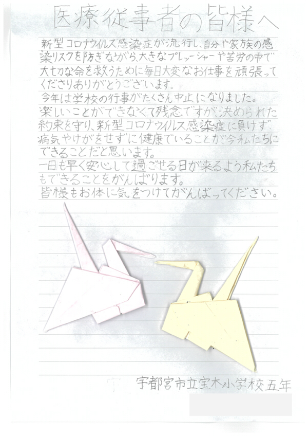 医療従事者へのお手紙 ※クリックで拡大します。 ※個人情報保護のため、お名前を伏せた形で掲載しています。